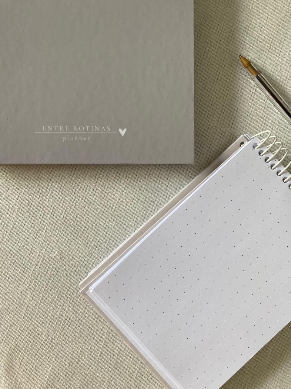 Bloco de anotações tamanho A6, capa dura, espiral metálica e folhas pontilhadas.